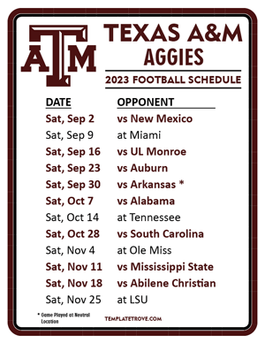 Printable 2023 Texas A&M Aggies Football Schedule